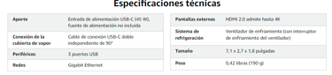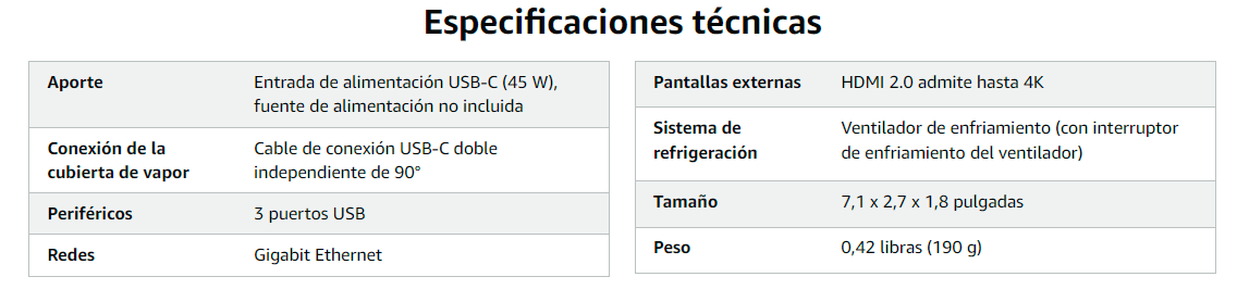 La caja viene con una estación de acoplamiento Steam*1, un cable USB-C doble de 90 grados*1, un manual del usuario*1 (NOTA: No incluye adaptador de corriente CA ni cable HDMI)