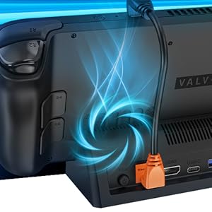 La base de Steam Deck tiene un ventilador de refrigeración incorporado y un botón de encendido y apagado en la parte posterior. Incluso si está jugando. Cuando esté en la base o cargue, su Steam Deck se mantendrá constantemente a una temperatura normal/baja. Mantenga la vida útil de su Steam Deck como debería ser.