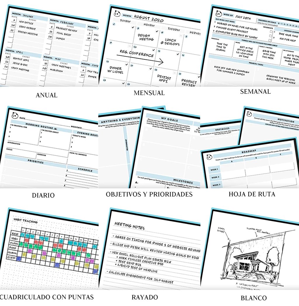 La variedad de tipos de página hace que el cuaderno sea útil para múltiples propósitos, desde tomar notas hasta planificar.